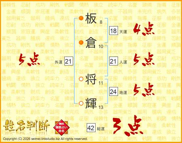 板倉将輝さんの地運は24画の5点!