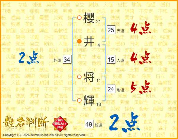 櫻(21画)井(4画) 将(11画)輝(13画)