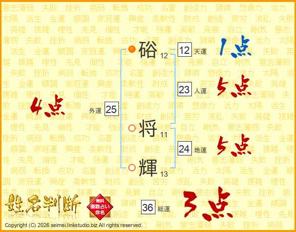 あなたの人生を表す1番重要な運勢です。生涯を通じて影響する総合運となり、主に50歳以降の晩年期に影響を及ぼします。苗字と名前の合計画数。