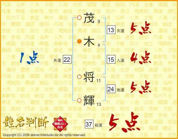 茂(9画)木(4画) 将(11画)輝(13画)