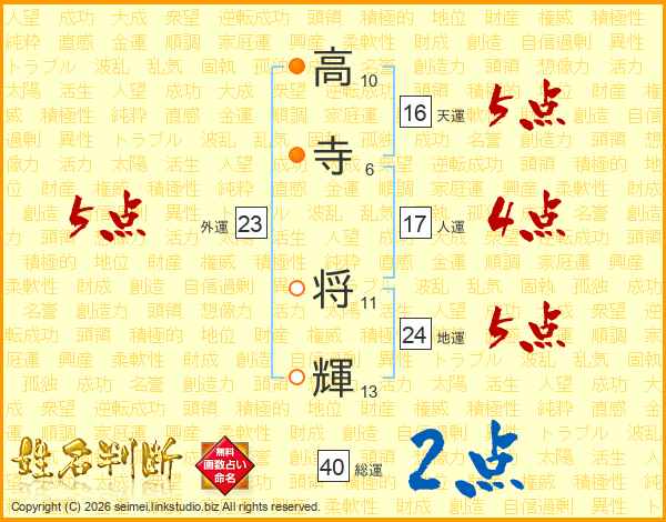 あなたの人生を表す1番重要な運勢です。生涯を通じて影響する総合運となり、主に50歳以降の晩年期に影響を及ぼします。苗字と名前の合計画数。