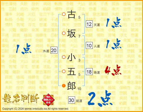 古(5画)坂(7画) 小(3画)五(5画)郎(10画)