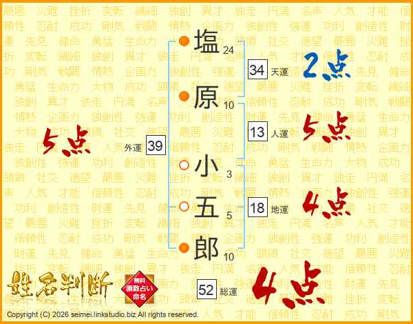 塩(24画)原(10画) 小(3画)五(5画)郎(10画)