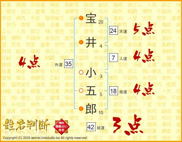 宝(20画)井(4画) 小(3画)五(5画)郎(10画)