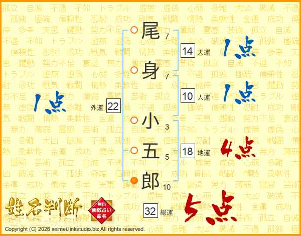 尾(7画)身(7画) 小(3画)五(5画)郎(10画)