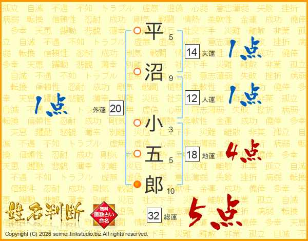 平(5画)沼(9画) 小(3画)五(5画)郎(10画)