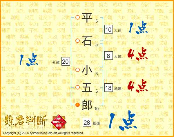 平(5画)石(5画) 小(3画)五(5画)郎(10画)