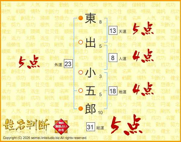 東(8画)出(5画) 小(3画)五(5画)郎(10画)