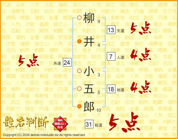 柳(9画)井(4画) 小(3画)五(5画)郎(10画)