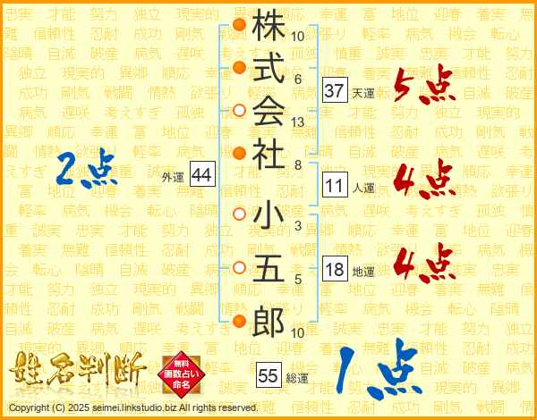 株(10画)式(6画)会(13画)社(8画) 小(3画)五(5画)郎(10画)