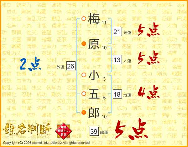 梅原小五郎さんの総運は39画の5点!