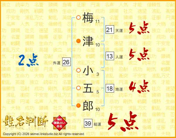 梅(11画)津(10画) 小(3画)五(5画)郎(10画)