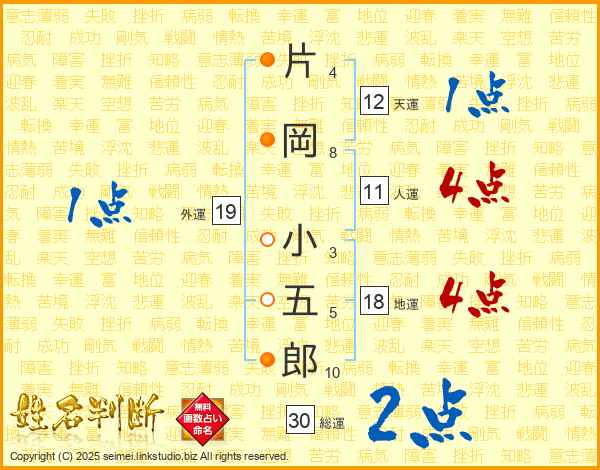 片(4画)岡(8画) 小(3画)五(5画)郎(10画)