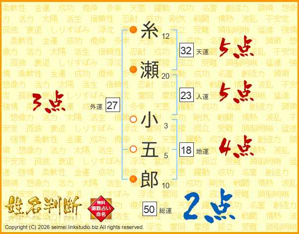 糸(12画)瀬(20画) 小(3画)五(5画)郎(10画)