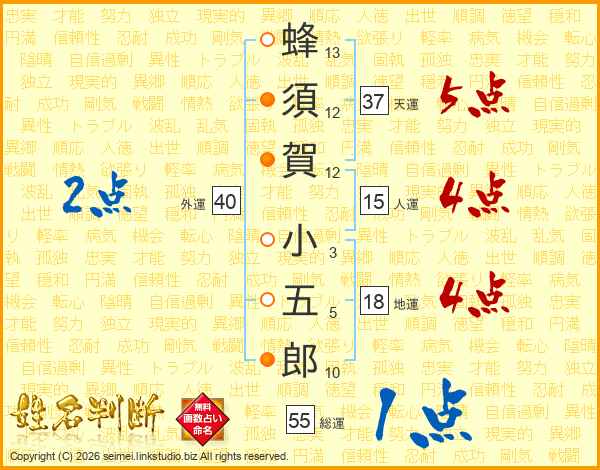 蜂(13画)須(12画)賀(12画) 小(3画)五(5画)郎(10画)