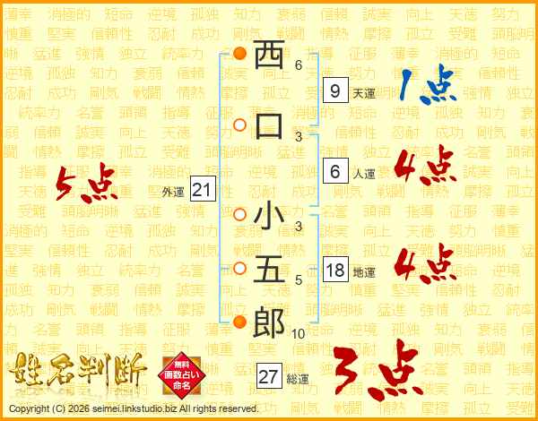 西(6画)口(3画) 小(3画)五(5画)郎(10画)