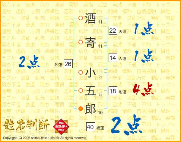 酒(11画)寄(11画) 小(3画)五(5画)郎(10画)