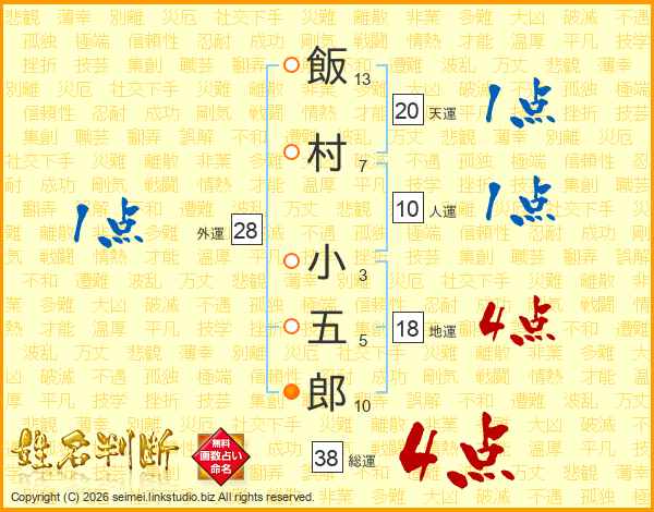 飯(13画)村(7画) 小(3画)五(5画)郎(10画)