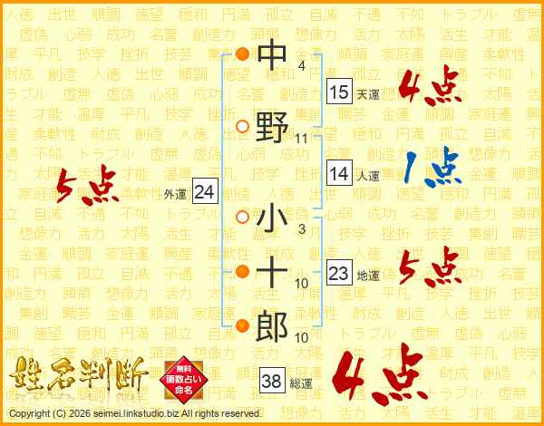 中(4画)野(11画) 小(3画)十(10画)郎(10画)