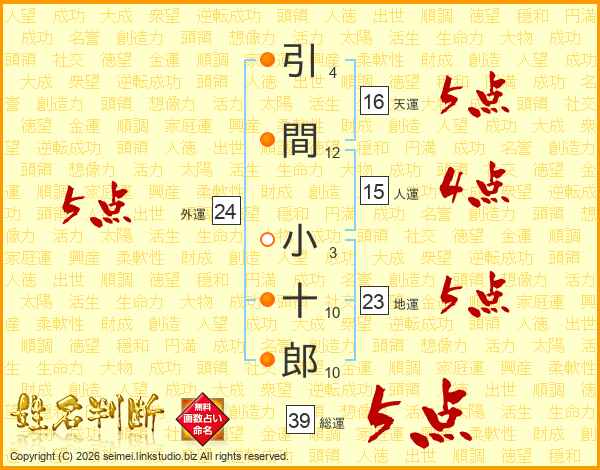 引間小十郎さんの総運は39画の5点!