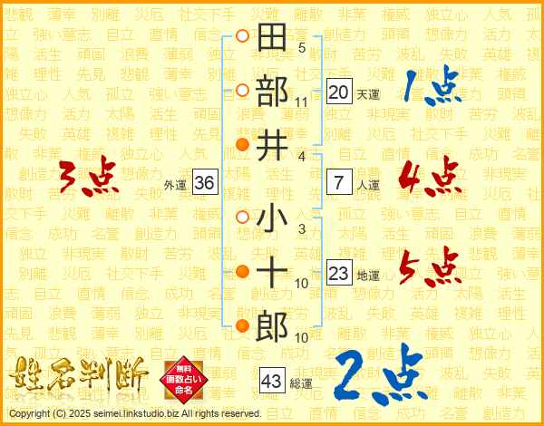 生活面を象徴する運勢です。外部から受ける影響力を表し、結婚運、家庭運や職場、環境への順応性を表します。総運から人運を引いた画数。姓や名が1文字の場合を除く。