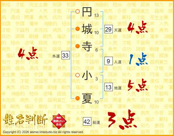 円(13画)城(10画)寺(6画) 小(3画)夏(10画)