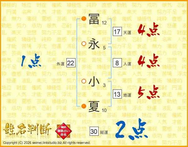 冨(12画)永(5画) 小(3画)夏(10画)