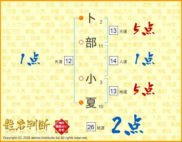 生活面を象徴する運勢です。外部から受ける影響力を表し、結婚運、家庭運や職場、環境への順応性を表します。総運から人運を引いた画数。姓や名が1文字の場合を除く。