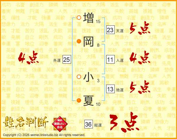 増(15画)岡(8画) 小(3画)夏(10画)