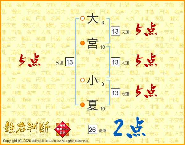 生活面を象徴する運勢です。外部から受ける影響力を表し、結婚運、家庭運や職場、環境への順応性を表します。総運から人運を引いた画数。姓や名が1文字の場合を除く。