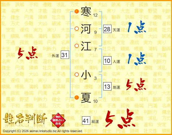 生活面を象徴する運勢です。外部から受ける影響力を表し、結婚運、家庭運や職場、環境への順応性を表します。総運から人運を引いた画数。姓や名が1文字の場合を除く。
