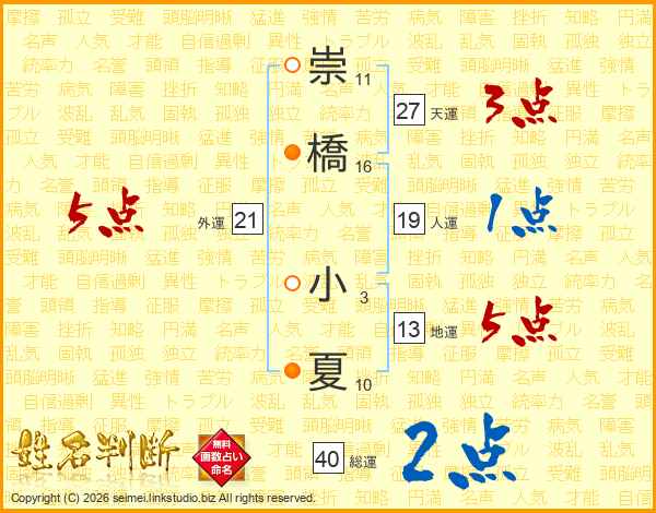 崇(11画)橋(16画) 小(3画)夏(10画)