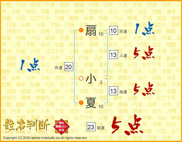 生活面を象徴する運勢です。外部から受ける影響力を表し、結婚運、家庭運や職場、環境への順応性を表します。総運から人運を引いた画数。姓や名が1文字の場合を除く。
