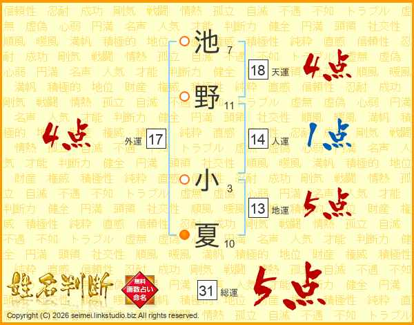 池野小夏さんの総運は31画の5点!