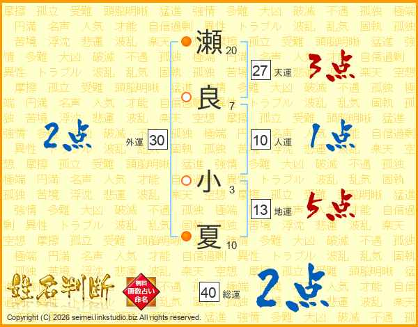 瀬(20画)良(7画) 小(3画)夏(10画)