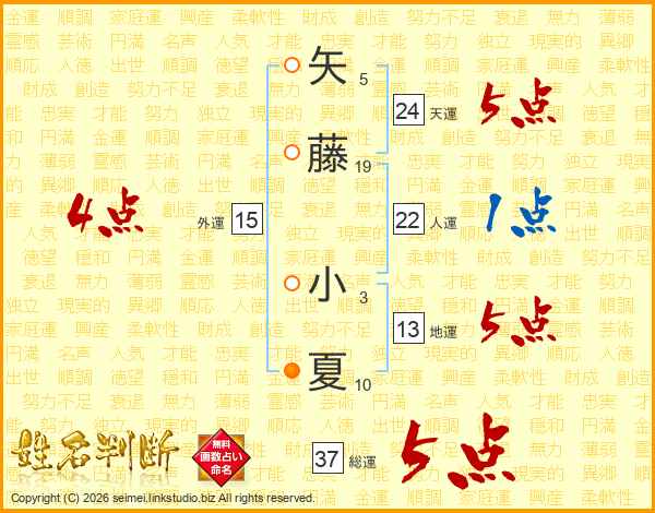 矢(5画)藤(19画) 小(3画)夏(10画)
