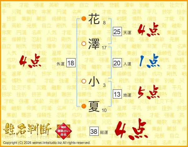 花(8画)澤(17画) 小(3画)夏(10画)