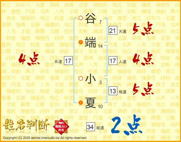 生活面を象徴する運勢です。外部から受ける影響力を表し、結婚運、家庭運や職場、環境への順応性を表します。総運から人運を引いた画数。姓や名が1文字の場合を除く。