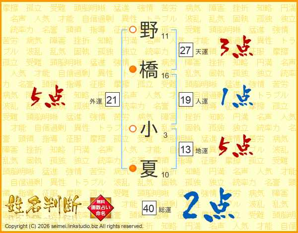 生活面を象徴する運勢です。外部から受ける影響力を表し、結婚運、家庭運や職場、環境への順応性を表します。総運から人運を引いた画数。姓や名が1文字の場合を除く。