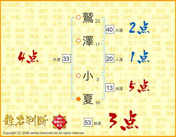 鷲(23画)澤(17画) 小(3画)夏(10画)