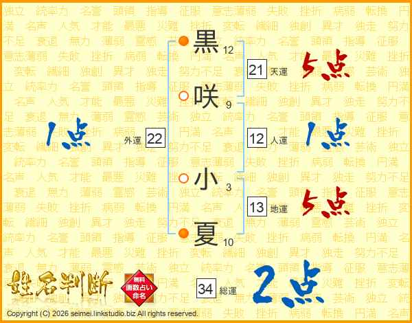 黒(12画)咲(9画) 小(3画)夏(10画)