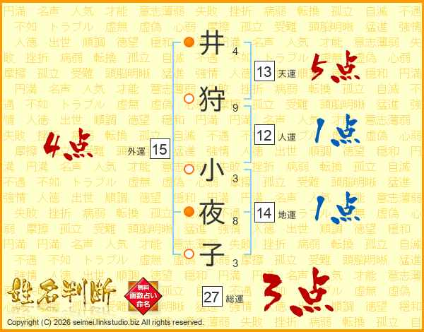 井(4画)狩(9画) 小(3画)夜(8画)子(3画)