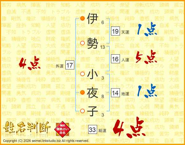 伊(6画)勢(13画) 小(3画)夜(8画)子(3画)