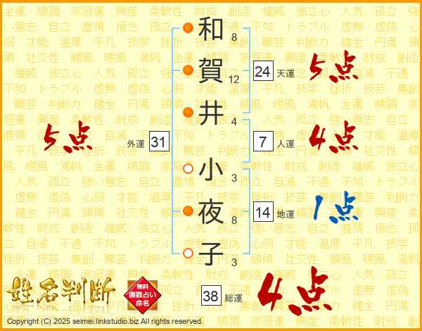 和(8画)賀(12画)井(4画) 小(3画)夜(8画)子(3画)