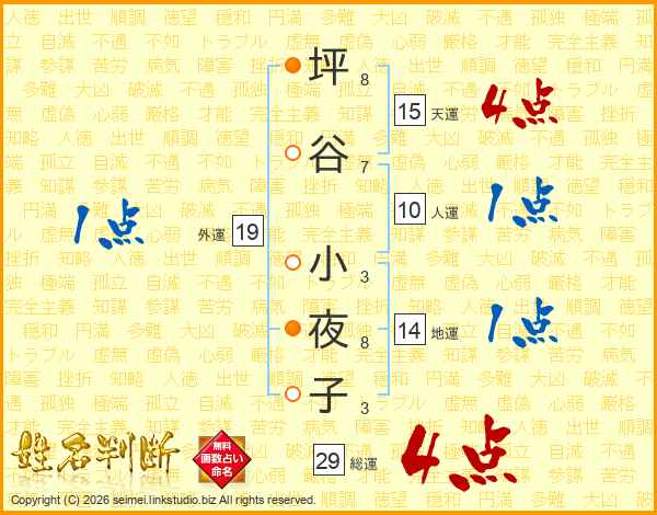 坪(8画)谷(7画) 小(3画)夜(8画)子(3画)