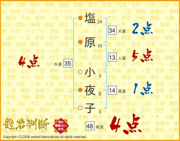 塩(24画)原(10画) 小(3画)夜(8画)子(3画)