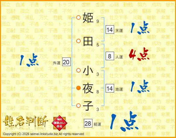 姫(9画)田(5画) 小(3画)夜(8画)子(3画)