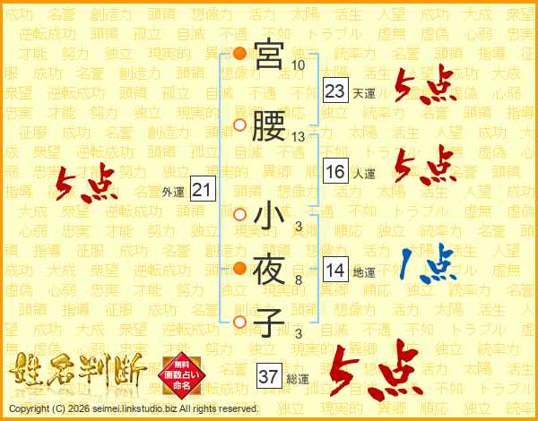 宮(10画)腰(13画) 小(3画)夜(8画)子(3画)