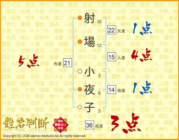 射(10画)場(12画) 小(3画)夜(8画)子(3画)