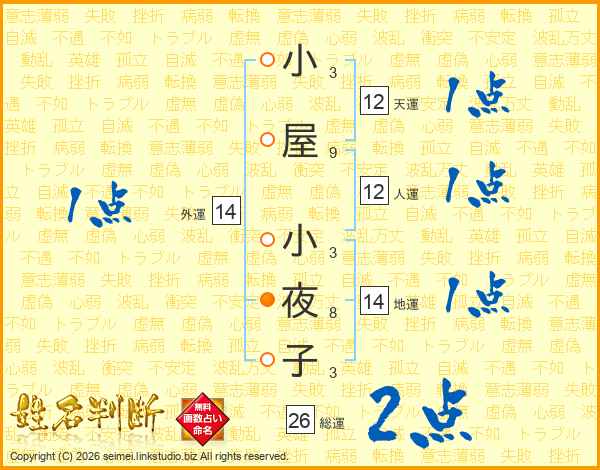 小(3画)屋(9画) 小(3画)夜(8画)子(3画)